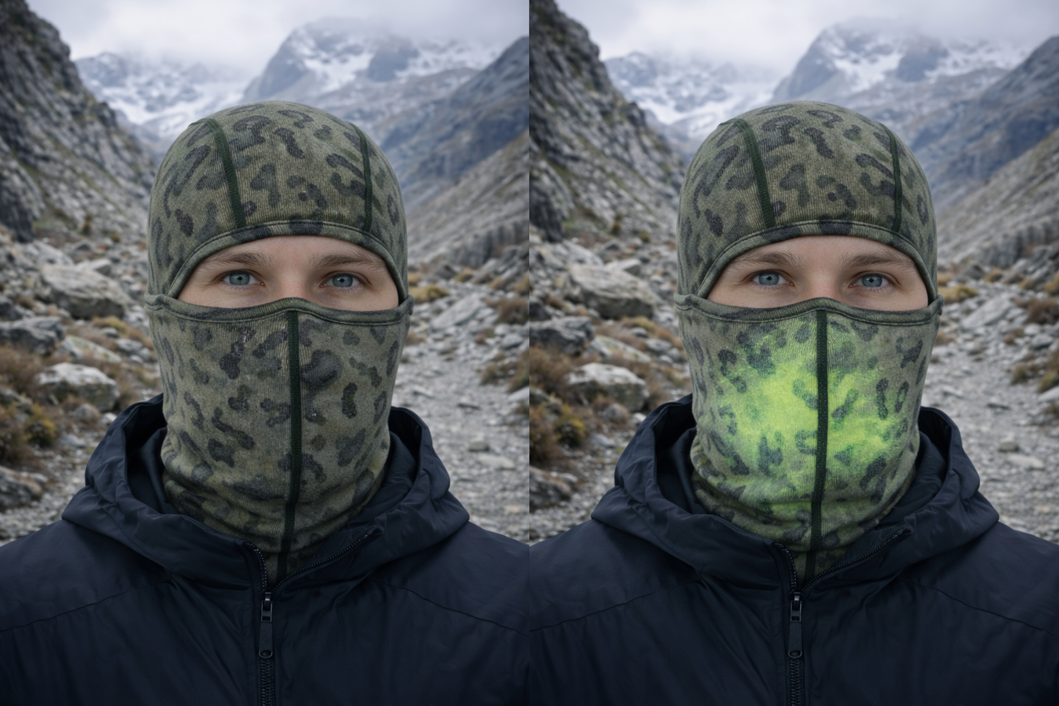 Heat-reactive fibers that activate with breath and body warmth, revealing a dynamic color shift in real time.