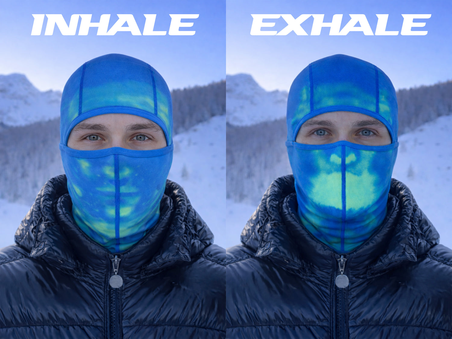 Heat-reactive fibers that activate with breath and body warmth, revealing a dynamic color shift.